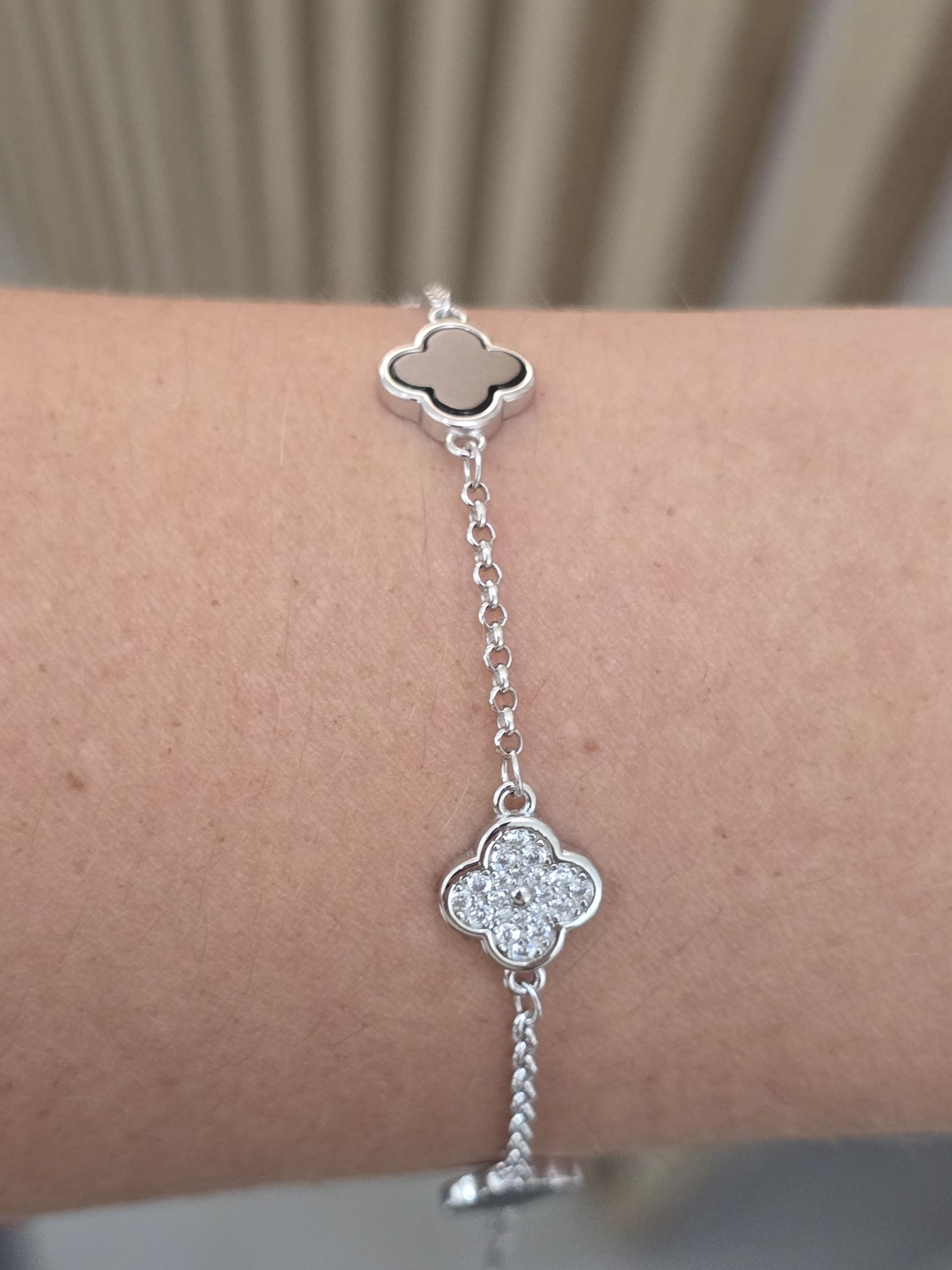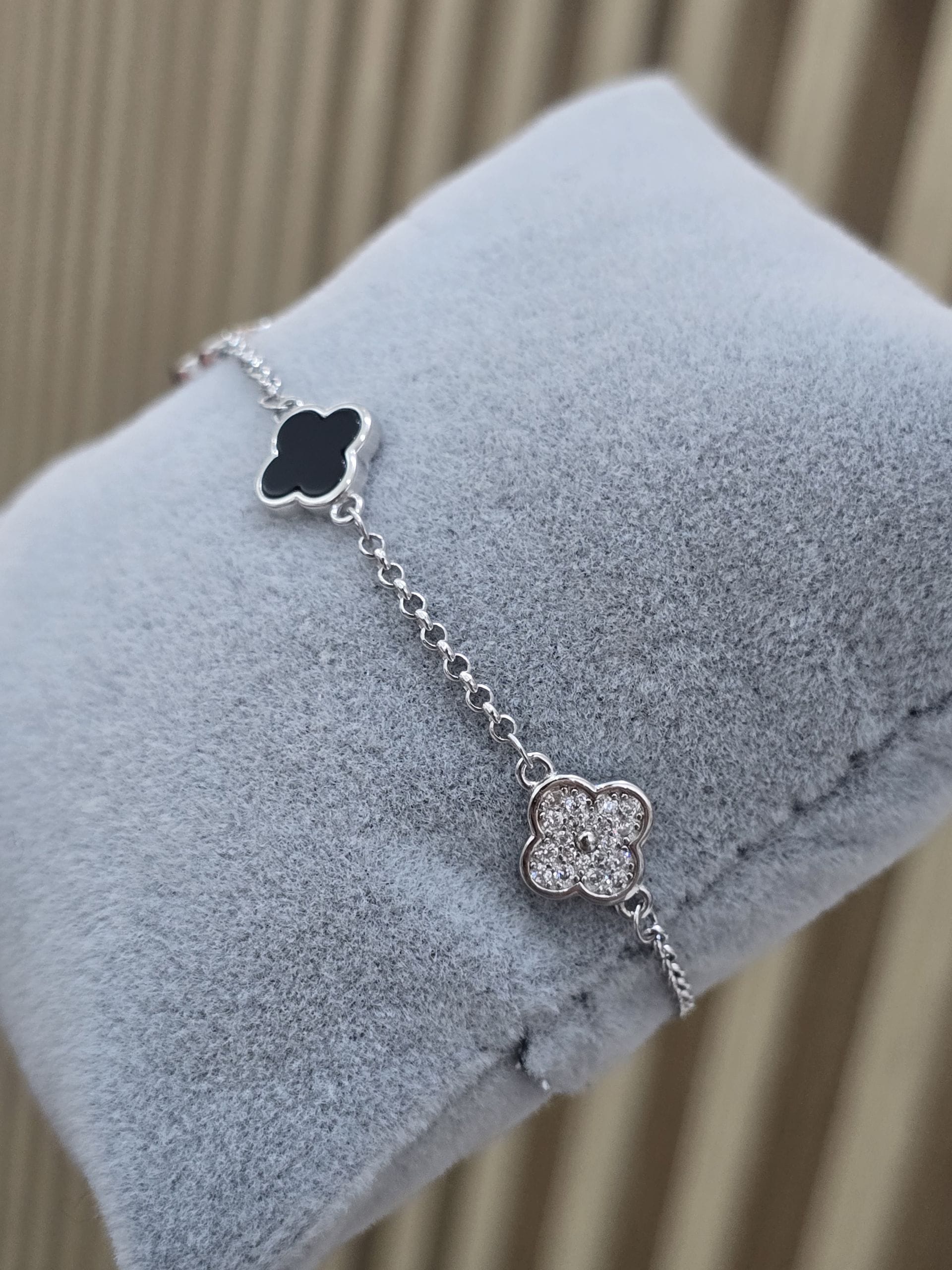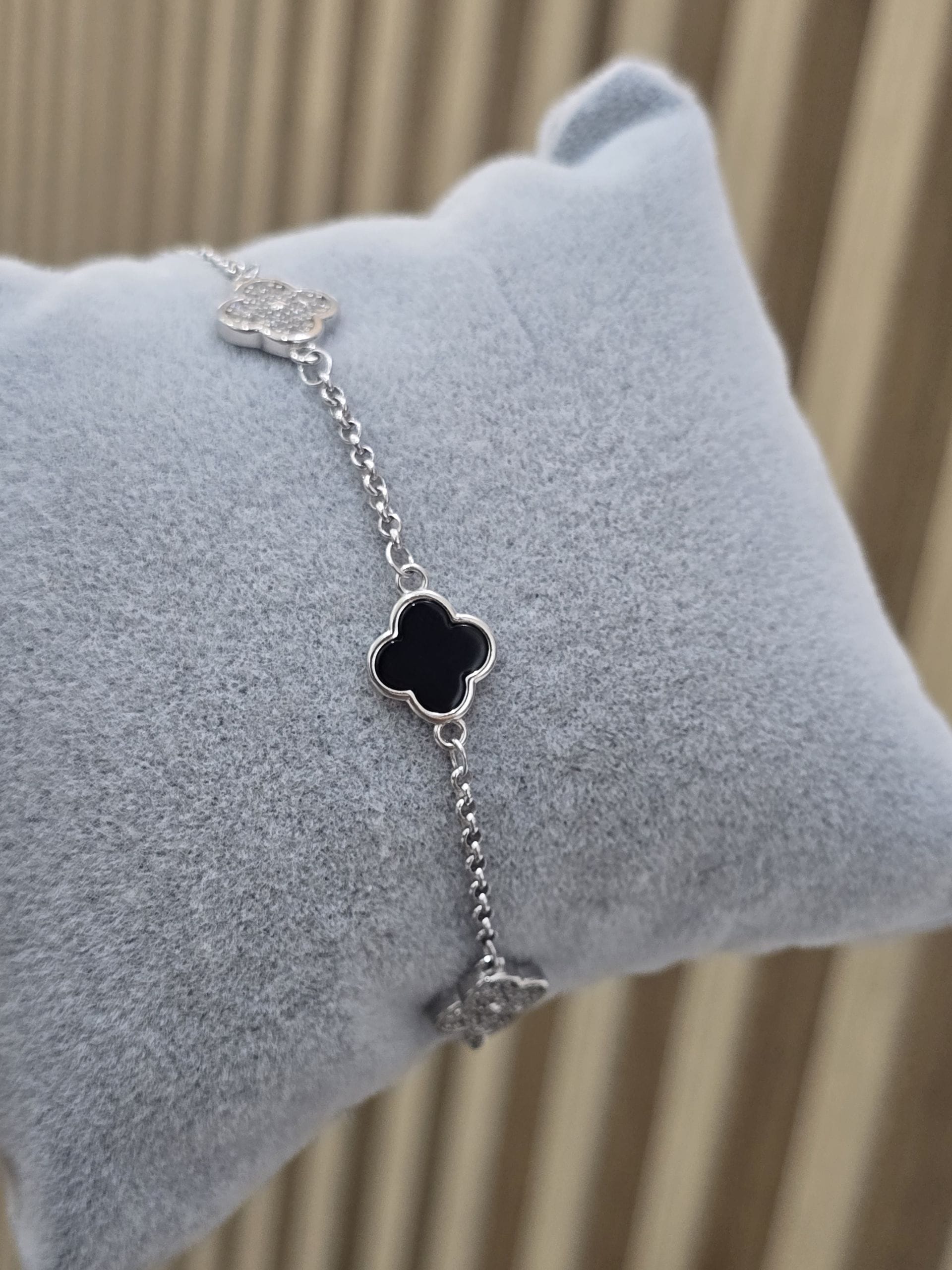 Pulsera de plata rodinada trebol nacar negro y pave cantidad